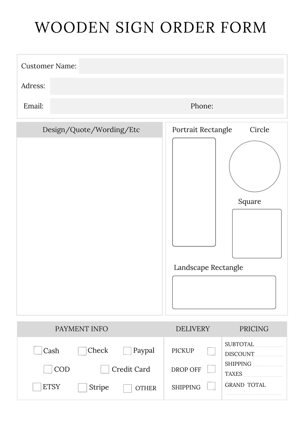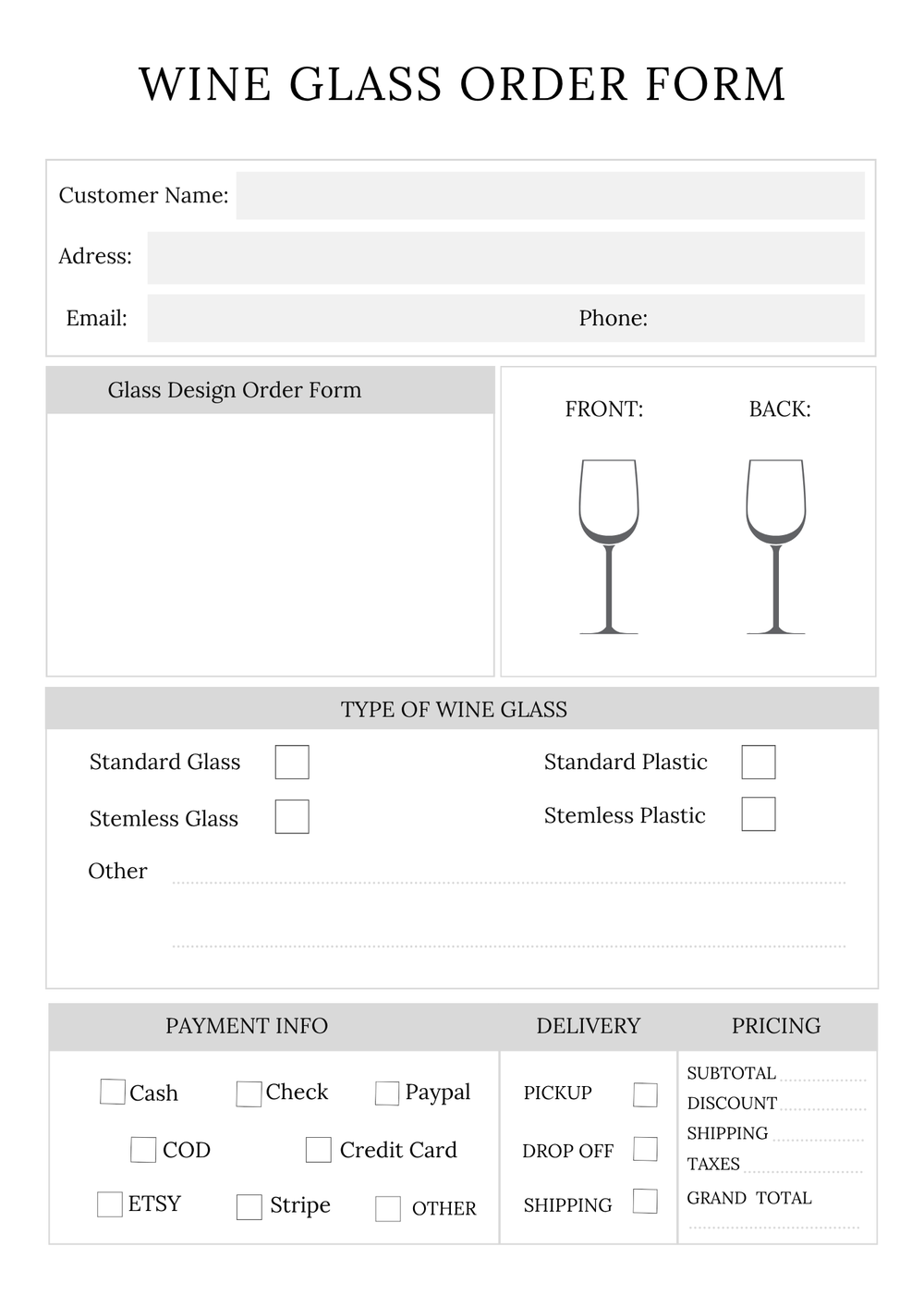 This comprehensive Order Forms Bundle is your one stop solution for managing a wide range of products with ease. Inside, you'll find dedicated order forms for t-shirts, can coolers mugs,phone grips,wooden signs,wine glasses,ornaments,custom items,print glass,and masks. Each form is designed with a clean,professional layout and is ready to streamline your order-taking process. Whether you're a small business owner or managing multiple product lines, this bundle ensures you have all the tools you need in one convenient package.